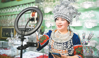在古州鎮(zhèn)老街,銀飾店店主在進(jìn)行網(wǎng)絡(luò)直播銷(xiāo)售銀飾。