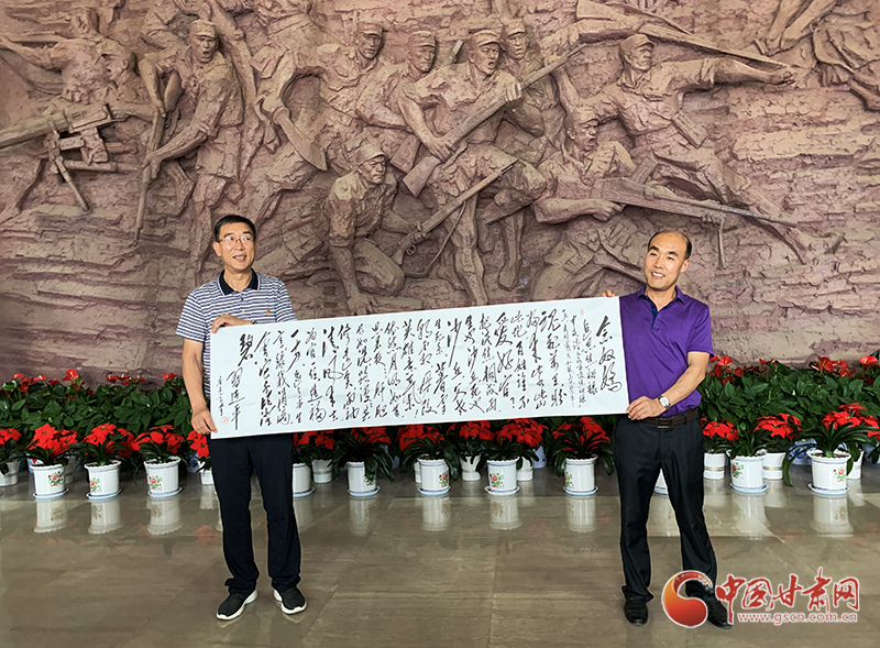 當(dāng)天,“追尋紅色足跡 弘揚延安精神”——紀(jì)念中央紅軍長征到達(dá)甘肅85周年調(diào)研采訪團(tuán)一行,還參觀了兩當(dāng)兵變舊址及全國青少年教育基地。省延安精神研究會副會長張富奎向兩當(dāng)兵變紀(jì)念館贈送了毛體書法作品。