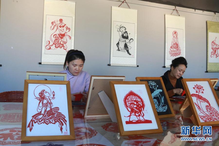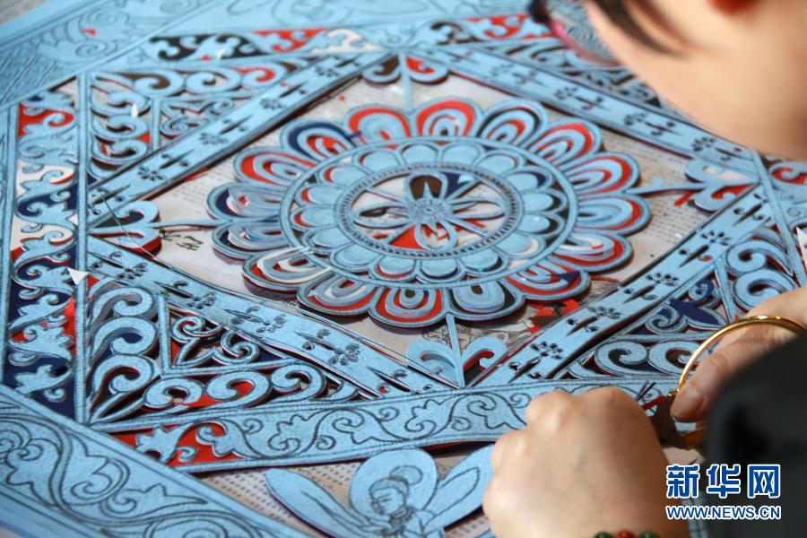 在甘肅敦煌小鎮(zhèn)鳴沙書(shū)院,學(xué)員在“敦煌剪紙”酒泉市級(jí)非物質(zhì)文化遺產(chǎn)代表性傳承人莊生娟的工作室內(nèi)剪紙(2020年12月31日攝)。新華社發(fā)(張曉亮 攝)