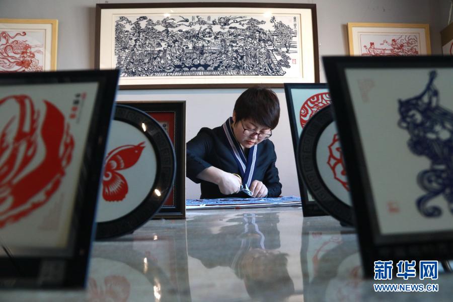 在甘肅敦煌小鎮(zhèn)鳴沙書(shū)院,“敦煌剪紙”酒泉市級(jí)非物質(zhì)文化遺產(chǎn)代表性傳承人莊生娟在自己的工作室內(nèi)創(chuàng)作(2020年12月31日攝)。新華社發(fā)(張曉亮 攝)