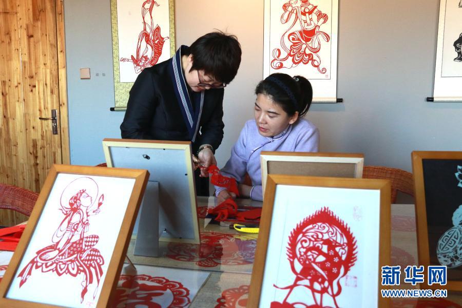 在甘肅敦煌小鎮(zhèn)鳴沙書(shū)院,“敦煌剪紙”酒泉市級(jí)非物質(zhì)文化遺產(chǎn)代表性傳承人莊生娟(左)在自己的工作室內(nèi)指導(dǎo)學(xué)員剪紙(2020年12月31日攝)。新華社發(fā)(張曉亮 攝)