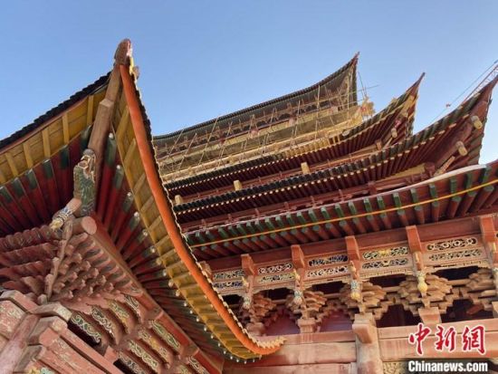 圖為5月上旬,甘肅山丹縣大佛寺內(nèi),正在修繕中的古建筑大雄寶殿。 中新社記者 高展 攝