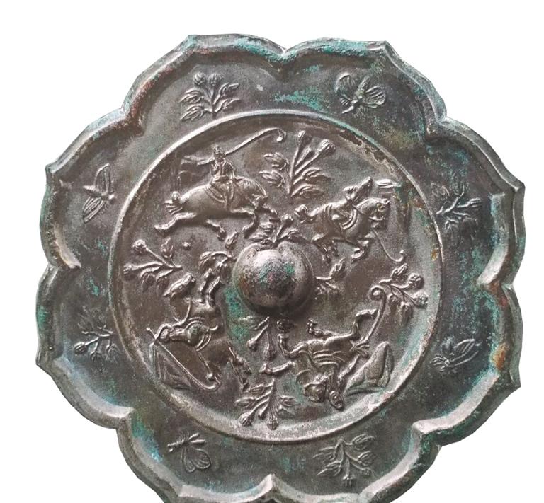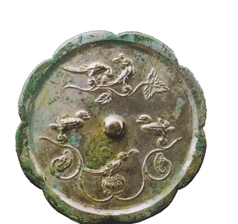 隋唐時期是中國封建政治經(jīng)濟文化高度發(fā)展繁榮的時期,唐代社會經(jīng)濟全面發(fā)展,手工業(yè)各部門也都興旺發(fā)達(dá),青銅鑄造業(yè)中的銅鏡業(yè)尤為突出,無論造型、題材、紋飾、鑄造工藝,都突破了前代的模式,達(dá)到了中國古代銅鏡藝術(shù)的巔峰。唐鏡鏡型厚實,方形鏡、菱花形鏡、葵花形鏡流行;紋飾題材多見瑞獸、飛鳥以及葡萄、花草等;瑞獸葡萄鏡最具特色,是中西文化融合的杰作。