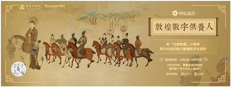 除了創(chuàng)意互動(dòng)帶來的新奇體驗(yàn),敦煌研究院與騰訊在“99公益日”還將發(fā)布文博行業(yè)首個(gè)公益NFT(Non-Fungible Token,非同質(zhì)化通證)藏品。9月9日9時(shí)開始,用戶在“云游敦煌”小程序參與文化答題即有機(jī)會(huì)獲得這款限量數(shù)字藏品。這份NFT藏品生動(dòng)呈現(xiàn)了《張議潮統(tǒng)軍出行圖》與《宋國(guó)河內(nèi)郡夫人宋氏出行圖》壁畫的細(xì)節(jié),并首次讓用戶在線上觀看到敦煌莫高窟第156窟的全景。