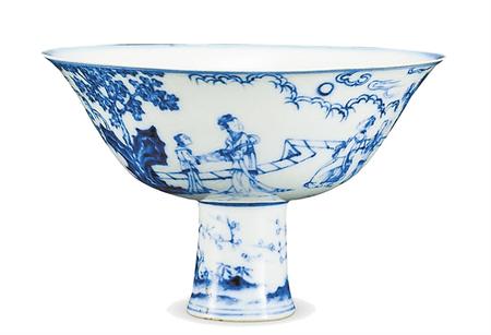 我國自古就有賞月祭月的習(xí)俗,這一習(xí)俗在文物里也有體現(xiàn),湖北省博物館收藏了一件青花瑤臺賞月圖瓷鍾。瓷鍾通高10.1厘米,口徑15.5厘米,足高4.6厘米,足徑4.2厘米,屬官窯出品,白胎,胎質(zhì)細膩,器壁光亮胎薄,叩之其聲如磬。瓷鍾上繪有“瑤臺賞月圖”,三組人物故事現(xiàn)于瓷鍾外壁:第一組有一老婦人側(cè)身坐在石墩上,身后站一侍女,雙手持扇,老婦對面站一年輕女子,其右側(cè)立一童子。第二組和第三組各有一青年女子和丫環(huán),畫面還有遠山、祥云和花草。“瑤臺賞月圖”紋飾在瓷器界又被稱為“人物紋”,較為罕見,圖中人物共賞天上一輪圓月,與宋人所繪《瑤臺步月圖》一脈相承,意境優(yōu)美,風(fēng)格清新動人。