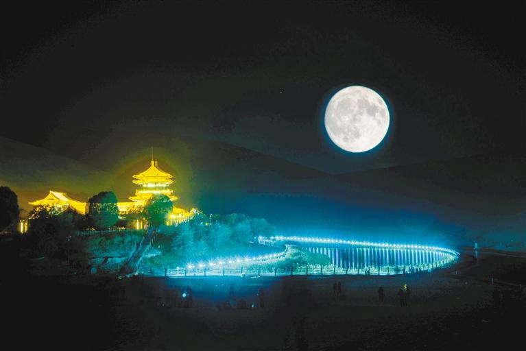 中秋時節(jié),敦煌涼風(fēng)習(xí)習(xí),暑氣漸消,鳴沙山?jīng)]有酷熱,只有柔軟的沙。白天你可以在鳴沙山騎駱駝、滑沙、駕駛沙漠卡丁車、跳傘、沙浴、沙療,與鳴沙山·月牙泉來一次徹底的親密接觸,而當(dāng)夜幕降臨,沒有一聲寒暄,也用不著預(yù)告,一輪圓潤皎潔的明月緩緩從山邊升起,你可以在這里看聚沙為山,銀光閃動,滿月下的鳴沙山竟如此優(yōu)雅而迷人。