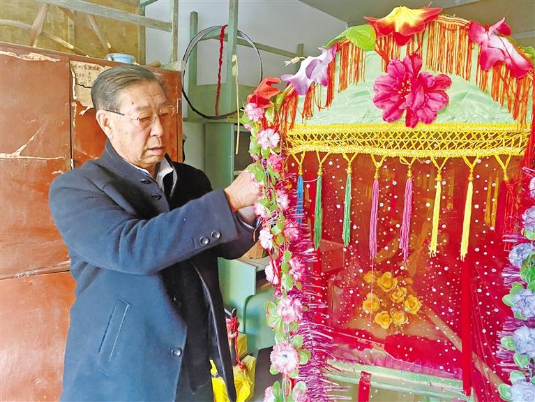除了編排社火曲目,閆文發(fā)還親手制作道具。“有的道具貴,或者買(mǎi)不上,我就自己琢磨、自己做。”花轎、旱船、白龍馬……做得惟妙惟肖。“我們的曲目需要啥道具,閆老師都能做,手特別巧,給社火隊(duì)節(jié)約了不少成本。”隊(duì)友張吉榮對(duì)閆文發(fā)的手藝贊不絕口。