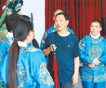 牛勃(右二)在排練間隙給演員講戲。