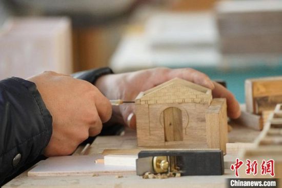 圖為古建筑模型工作室內(nèi)工作人員正在制作模型。 九美旦增  攝
