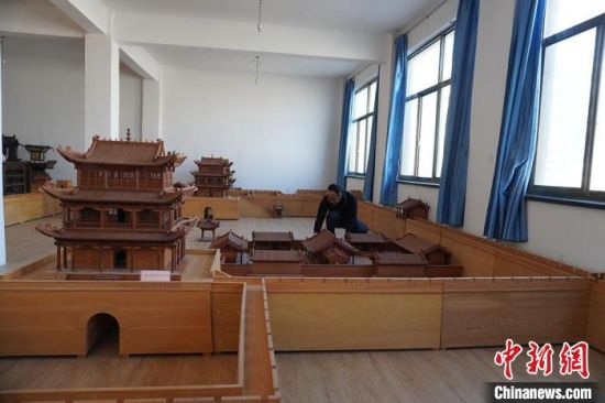 圖為古建筑模型制作技藝傳習(xí)所展廳內(nèi)的微縮古建筑作品?!【琶赖┰?nbsp; 攝