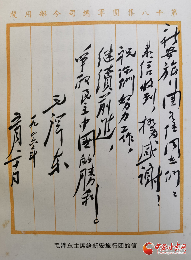 1946年5月20日,毛澤東主席給新旅回信:“新安旅行團(tuán)各位同志們:來(lái)信收到,極為感謝!祝你們努力工作,繼續(xù)前進(jìn),爭(zhēng)取民主中國(guó)的勝利。”時(shí)隔75年后的2021年5月30日,習(xí)近平總書(shū)記給新安小學(xué)的少先隊(duì)員們回信:“當(dāng)年,在黨的關(guān)懷和領(lǐng)導(dǎo)下,‘新安旅行團(tuán)’不怕艱苦,足跡遍及大半個(gè)中國(guó),以文藝為武器,喚起民眾抗日救亡,宣傳黨的主張,展現(xiàn)了愛(ài)國(guó)奮進(jìn)的精神風(fēng)貌。希望你們結(jié)合自身成長(zhǎng)實(shí)際學(xué)好黨史,以英雄模范人物為榜樣,從小堅(jiān)定聽(tīng)黨話、跟黨走的決心,刻苦學(xué)習(xí),樹(shù)立理想,砥礪品格,增長(zhǎng)本領(lǐng),努力實(shí)現(xiàn)德智體美勞全面發(fā)展。”