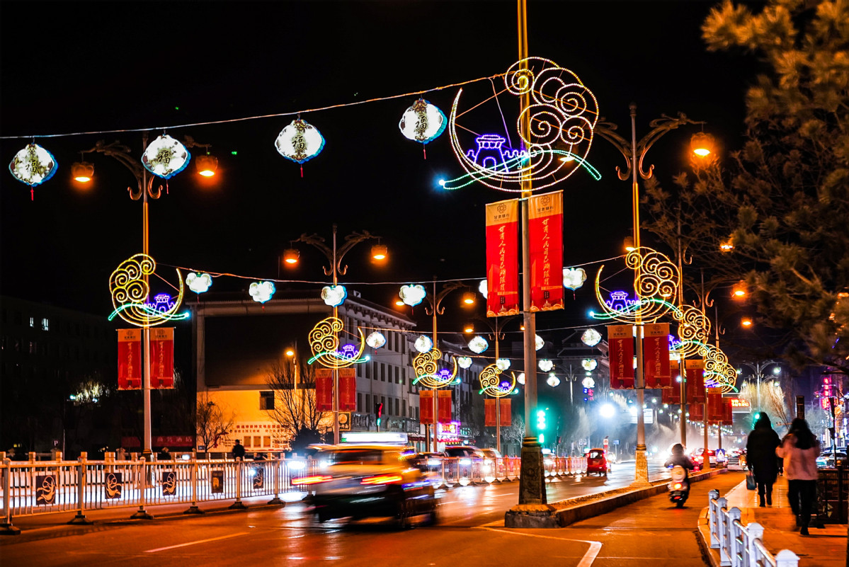 1月25日晚,甘肅省敦煌市“人類敦煌·心向往之”2022年新春文化燈展布置完成并亮燈,古郡敦煌大街小巷燈火輝煌,文化彩燈點亮古郡夜空。