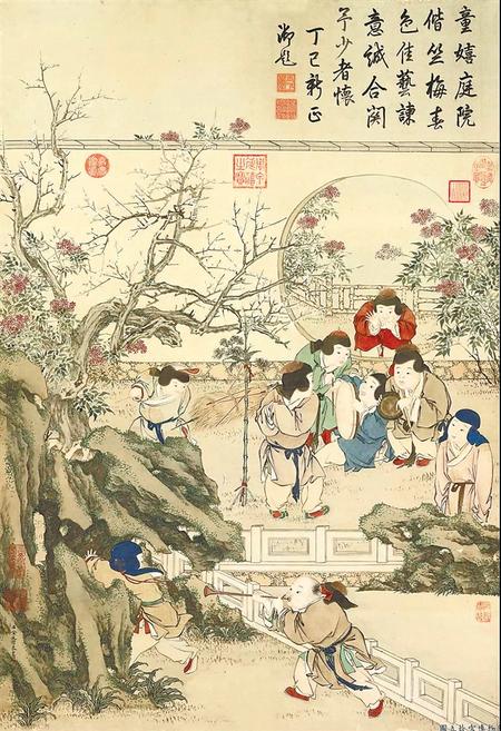 金廷標的歲朝圖中,將嬰戲的場景置于種滿梅花和天竹的庭院中,小孩們敲鑼擊鼓吹嗩吶,洋溢著新春的吉慶熱鬧。