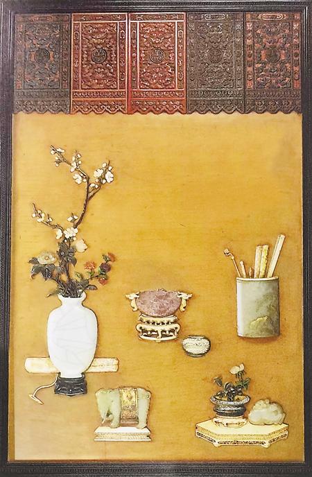百寶嵌歲朝吉祥御制題詩掛屏,使用各種瓷、玉、寶石、金銀材料鑲嵌而成,也只有皇家才能制作。其中各部分零星擺放,相互之間無甚關聯(lián),已經(jīng)出現(xiàn)歲朝圖圖案化的苗頭。在后來的發(fā)展中,歲朝清供圖演變成裝飾圖案,出現(xiàn)在服飾、建筑等藝術中。