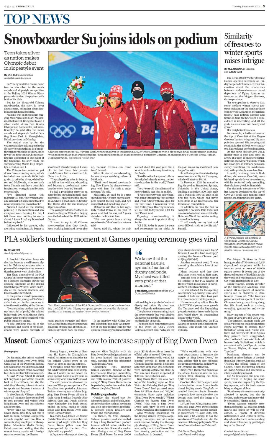 《中國日報》2月8日三版,對敦煌莫高窟壁畫與冬季運動的相似性進行了報道。