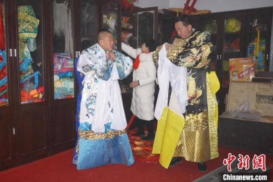 2月16日,表演者正在甘肅蘭州市永登縣苦水街穿上傳統(tǒng)戲服,準(zhǔn)備高高蹺表演。 九美旦增 攝