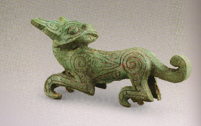 禮縣大堡子山祭祀樂器坑出土,共三只,造型相同,大小相似,為全國虎伴樂器出土的首例。其形象回首卷尾、聳耳曲爪、憨態(tài)可掬,極具觀賞性,是春秋時(shí)期虎造型的杰作,體現(xiàn)了秦國早期高超的造型能力和精湛的鑄造技術(shù)?;⒌男蜗笤诖呵锴厝说钠魑镏卸嘁?,不但有自成個(gè)體的金虎、青銅回首虎,同時(shí)虎作為附飾也出現(xiàn)在一些大的青銅器上。