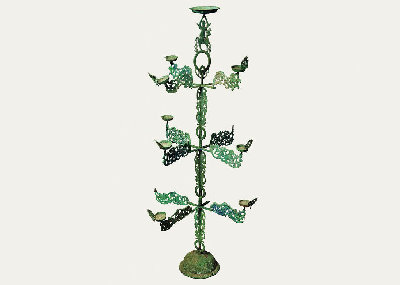 燈座為倒置喇叭形,座面飾瑞獸紋和云氣紋。燈呈樹形,主干分為三段,套插而成,段與段銜接處各置十字形托架,猶如燈樹之分枝。十字托橫向四出,四端各飾透雕花葉一個(gè),象征火焰,干枝頂端有仙人騎鹿形花飾。原有燈13盞,現(xiàn)存9盞。