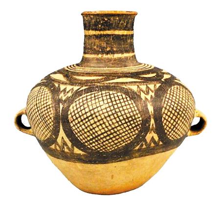 馬家窯文化半山類(lèi)型圓圈網(wǎng)格紋雙耳彩陶罐