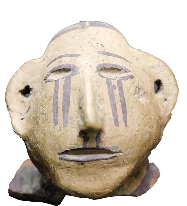 姓名:馬家窯文化馬廠類型人頭形彩陶器蓋 出生年代:距今約4350—4050年左右 住址:臨夏市博物館 體型:面部長(zhǎng)6.5厘米,寬6.5厘米,頭頂至后頸長(zhǎng)5.5厘米 自我描述: 我是國(guó)家一級(jí)文物。1992年,博物館工作人員從臨夏市王坪村村民手中收購(gòu)了我。我是由泥質(zhì)紅陶捏塑而成,我的表面略磨光,施黑彩,窄額長(zhǎng)臉,橢圓形眼,繪有眉毛,眼窩深陷,高鼻有鼻孔,雙耳較長(zhǎng)、呈半圓形,雙耳有小孔,大嘴微張,發(fā)式為直發(fā)、中分。頭發(fā)、眼輪廓線、嘴輪廓線均為黑彩繪就。特別值得一提的是,在我的雙眼下方臉頰上的雙直線條,仿佛是奪眶而出的眼淚。