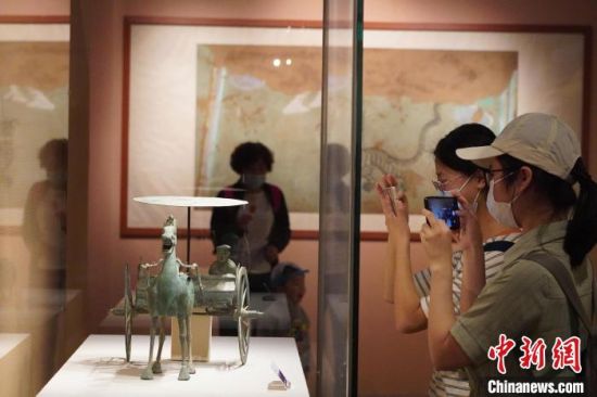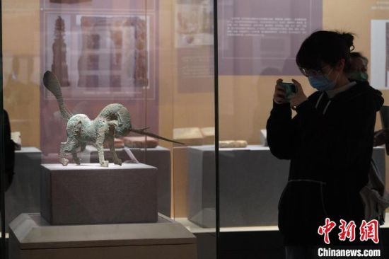 5月18日,游客來到位于蘭州的甘肅省博物館內(nèi)參觀《大道攸歸:五涼文化展》。圖為“銅獨(dú)角獸”?!【琶赖┰觥z