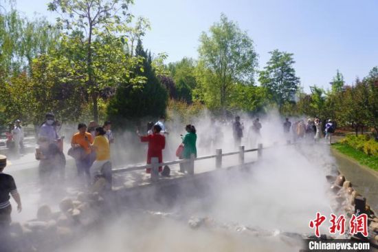 5月16日,甘肅蘭州,寓言故事園化身“瑤池”仙境美景,吸引不少市民前來觀賞、拍照。