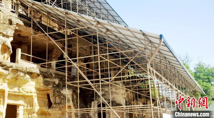 在北石窟寺,多體量多結(jié)構(gòu)腳手架支撐起保護(hù)棚,窟龕輪廓若隱若現(xiàn)。崔惠萍介紹說,該防水工程,屬于實(shí)驗(yàn)性,于2021年3月建成,能最大程度覆蓋遮擋崖體,保護(hù)崖面窟龕,防止雨水對(duì)石窟的沖蝕破壞。