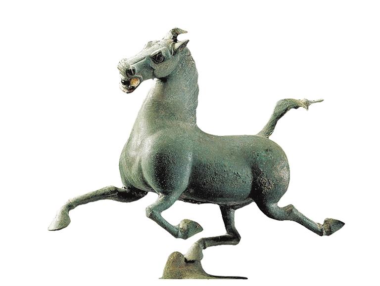注定不平凡的銅奔馬,終究迎來了屬于它的高光時(shí)刻——這匹馬,三足騰空,作昂首嘶鳴狀,正疾足奔馳……銅奔馬矯健的體態(tài)于奔馳中彰顯出一股強(qiáng)勁的力量,這股力量穿過身上的毛孔而酣暢釋放,這使得它腳下那只飛鳥也不禁吃驚且崇拜地回眸張望。