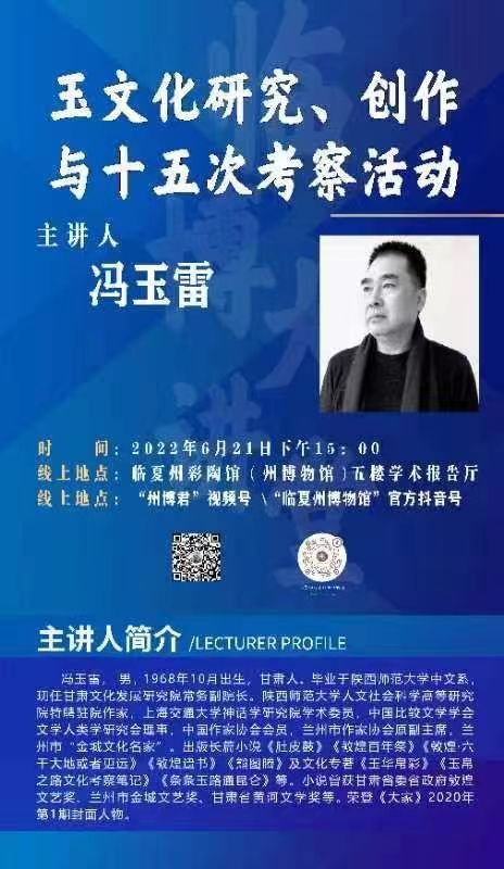 為認真貫徹落實省第十四次黨代會精神,進一步弘揚中國玉文化和民族精神,推動玉文化傳承及玉文化文創(chuàng)產(chǎn)業(yè)發(fā)展。6月21日下午,甘肅文化發(fā)展研究院常務(wù)副院長馮玉雷受邀在臨夏州彩陶館(州博物館)學(xué)術(shù)報告廳作了題為《玉文化研究、創(chuàng)作與十五次考察活動》的學(xué)術(shù)講座。