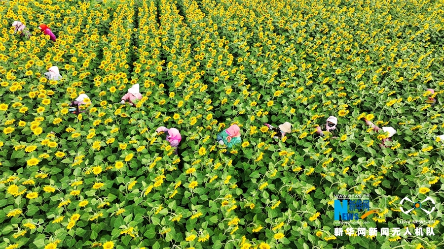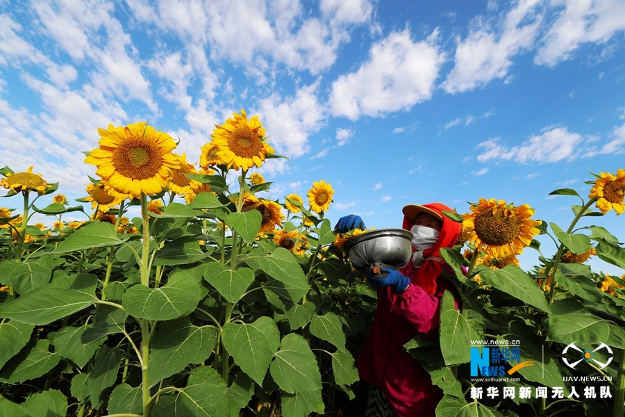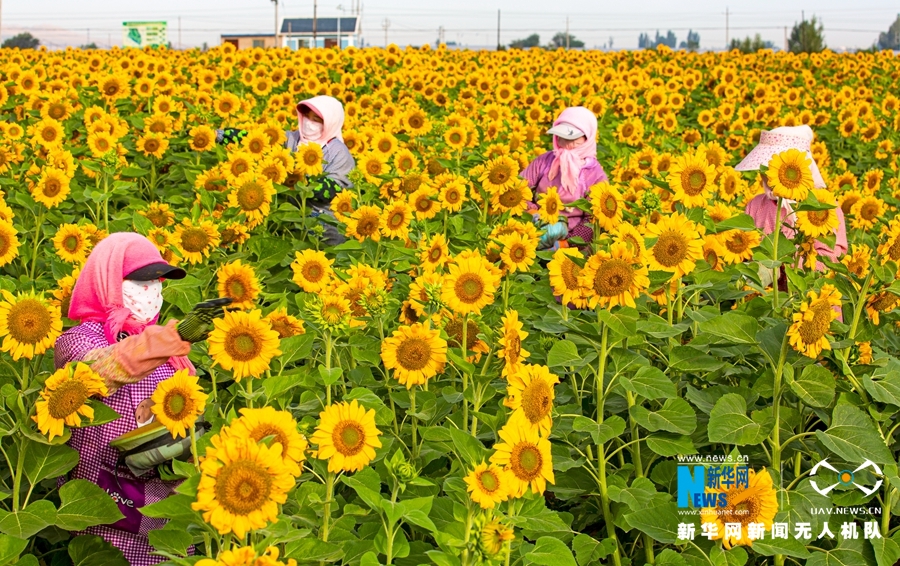 7月23日,甘肅省張掖市臨澤縣新華鎮(zhèn)長(zhǎng)莊村近千畝制種向日葵盛開,金色花海里數(shù)十名葵農(nóng)忙著為向日葵授粉。新華網(wǎng)發(fā)(成林 攝)