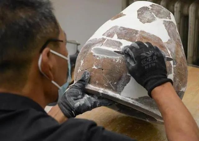 文物工作者對(duì)南佐遺址內(nèi)出土的陶器進(jìn)行修復(fù)(8月25日攝)。新華社記者 李賀 攝