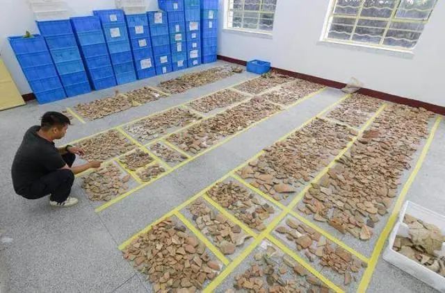 考古工作人員在南佐遺址研究基地整理出土的大量陶片(8月25日攝)。新華社記者 李賀 攝