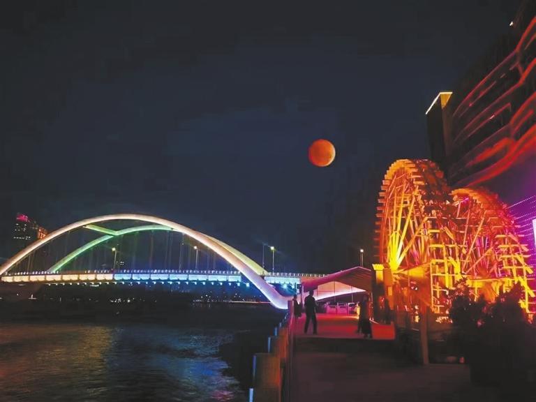 這是11月8日晚網(wǎng)友在蘭州黃河風情線拍攝的月食。