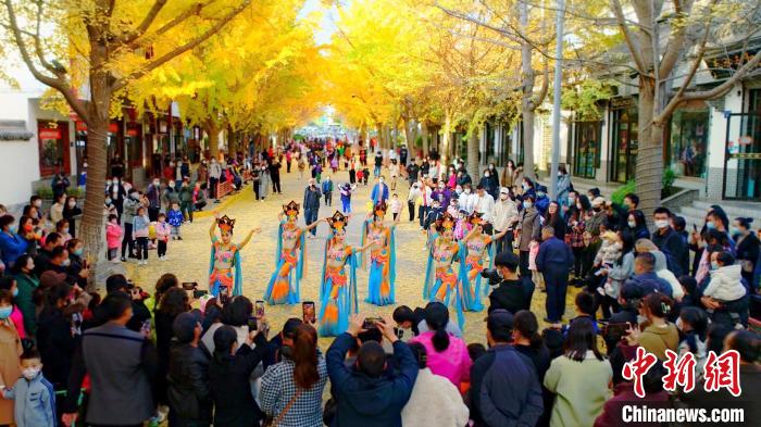 11月中下旬,在甘肅省天水市秦州區(qū)“黃金大道”上演了“絲路舞姿”,舞蹈是由秦州區(qū)文旅局組織的舞蹈隊(duì)帶來的舞蹈《絲路》《醉太平》和《萬疆》等。該路段由于216株銀杏樹的金黃色樹葉彼此參差相連,宛如兩條“黃金色帶”在道路兩側(cè),所以被當(dāng)?shù)鼐用穹Q為“黃金大道”。