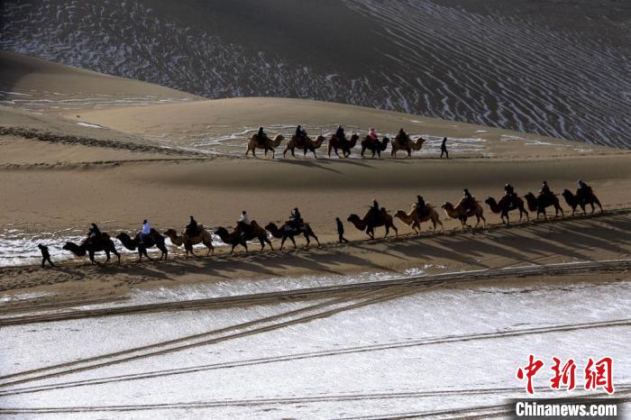 1月27日,游客騎駱駝暢游敦煌鳴沙山。魏佳秀 攝