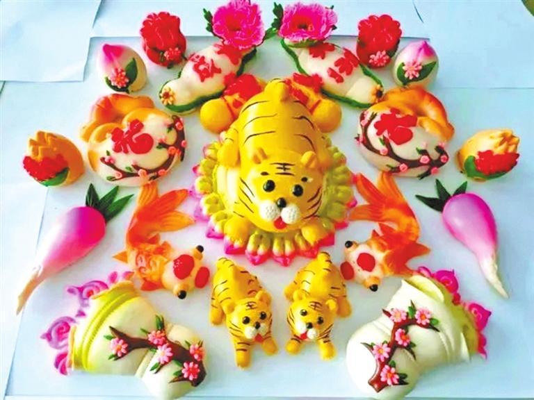 紅艷艷的牡丹花、形象各異的小動(dòng)物……王霞制作的花饃不再是普通的食材,而是栩栩如生的藝術(shù)品。放在展臺(tái)最中間的一個(gè)巨型花饃格外吸睛。這個(gè)花饃用一層層面餅做底座,每一層面餅上都有牡丹、月季、百合等各種花卉競(jìng)相開(kāi)放,不時(shí)有蝴蝶和小鳥(niǎo)停留在花朵上,充滿著喜意。