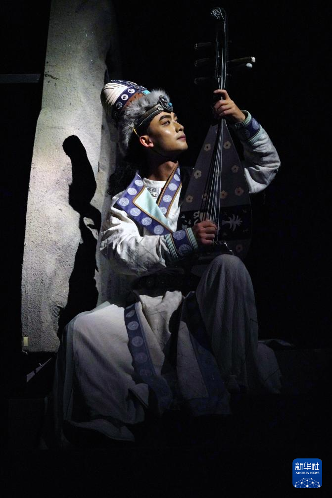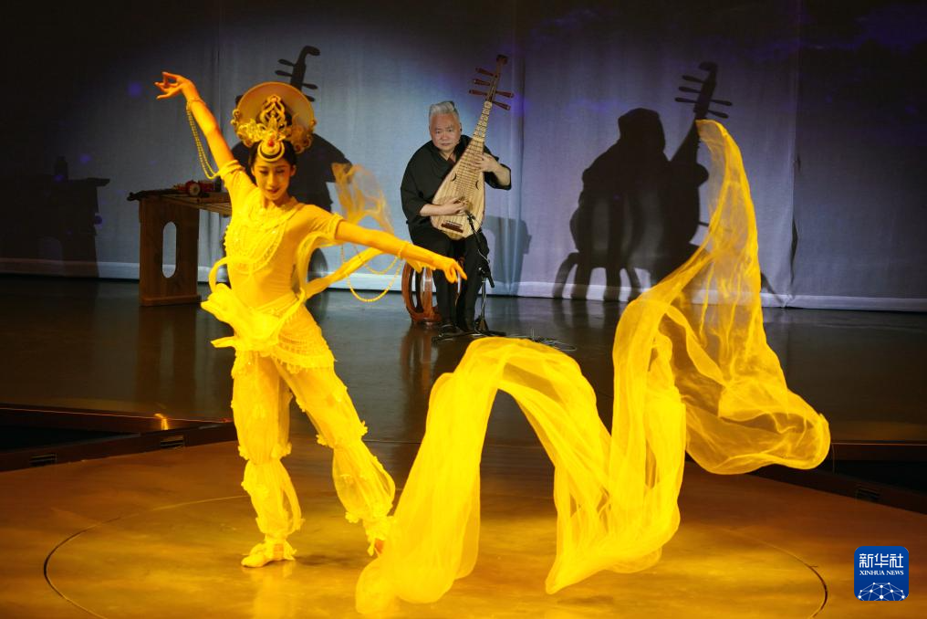 8月9日,在《樂動敦煌》演出現(xiàn)場,敦煌古樂全球推廣大使、國樂藝術(shù)家方錦龍演奏琵琶,為舞蹈演員伴奏。新華社記者 馬寧 攝