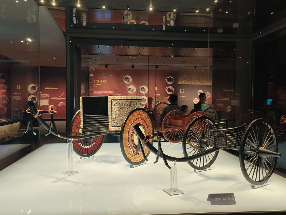 這些車輿依據(jù)張家川縣馬家塬遺址出土的車輛遺跡復(fù)制。馬家塬遺址是一處戰(zhàn)國晚期的西戎貴族墓地,共出土車輛遺跡69輛,隨葬品3600多件(套),2021年入選中國“百年百大考古發(fā)現(xiàn)”。