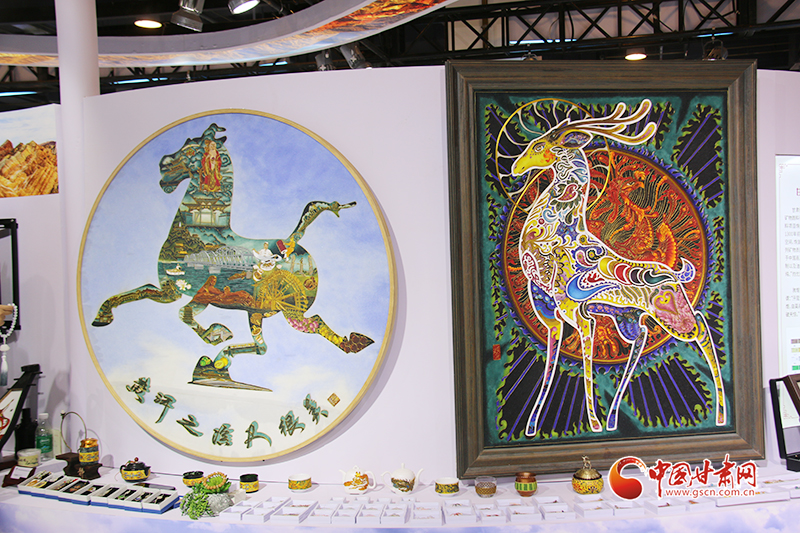 和阮琳的刻葫蘆一樣,由甘肅李明?,m瑯壁畫文化傳承發(fā)展有限公司展呈的“黃河之濱也很美”和靈動的九色鹿等充滿敦煌元素的掐絲琺瑯壁畫流光溢彩,精美絕倫,參觀問詢著絡(luò)繹不絕。