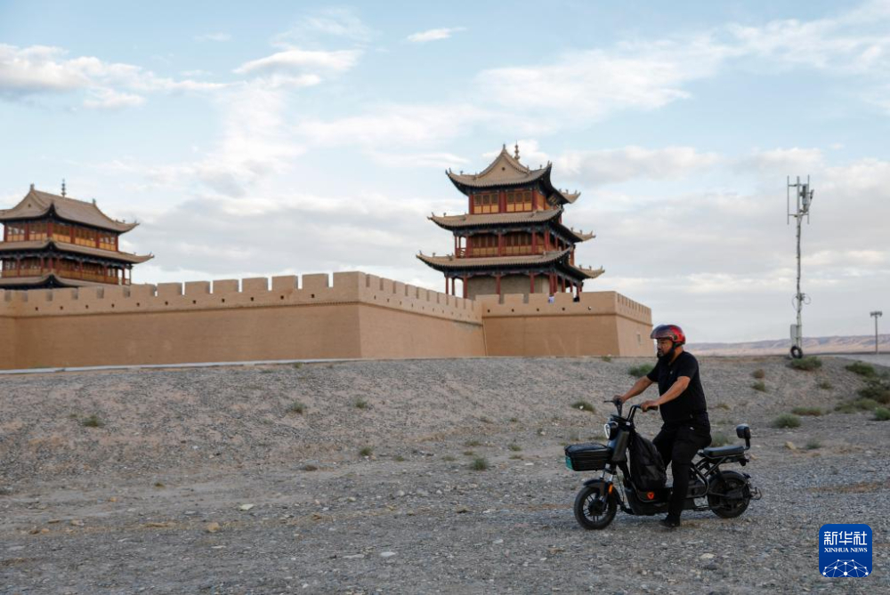 7月13日,李森結(jié)束一天的工作離開甘肅嘉峪關(guān)關(guān)城景區(qū)騎電動(dòng)車回家。新華社記者 方欣 攝