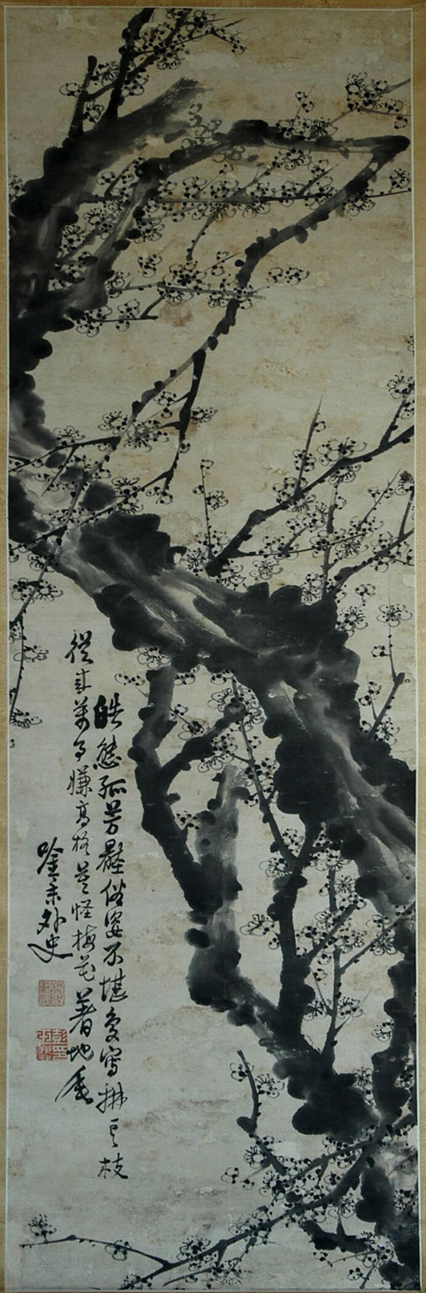 彭玉麟一生所作梅花不下萬幅,清水縣博物館館藏的這幅梅花圖屬館內(nèi)舊藏,其來歷已無從考證。這幅立軸梅花圖長133厘米,寬42厘米。畫面上,一棵下不見根底的老梅,蜿蜒盤旋凌空而上,好似神龍擺尾,顯得古拙蒼勁,點點梅花用寫意筆法一揮而就。畫作不著顏色,老干繁枝,遒勁如鐵,寒梅點點,暗香浮動,散發(fā)著濃厚的文人畫氣息。