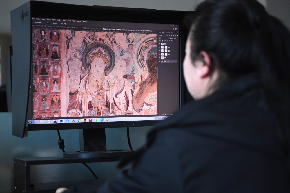 敦煌研究院文物數(shù)字化保護(hù)團(tuán)隊圖像處理人員年海麗在拼接壁畫圖像(2023年4月25日攝)。新華社記者 陳斌 攝