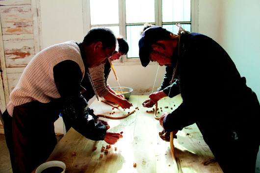 七十二行,釀酒、熬糖最繁瑣。香甜的麥芽糖,如同世間的其他事物一樣,都是通過勞苦換來的,正所謂苦盡甘來。田新民做灶糖用的是麥芽糖,首先要將原料小麥浸泡生芽,然后生成麥芽,不過有了麥芽,還要經(jīng)過多道工序才能變成麥芽糖。通常泡發(fā)麥芽之后,接下來就是蒸制配料,要依次進(jìn)行碾米、浸泡籠蒸、擠糖汁、二次籠蒸,再用力將麥芽搗碎,拌入蒸熟的黃米裝缸,加開水浸泡,淋出第一遍糖汁,再加開水淋出第二遍糖汁。然后再把兩次淋出的糖汁,倒至鐵鍋內(nèi)加小火,用木锨或木棒攪動(dòng),使水分蒸發(fā)凝結(jié)成固體,最終即得麥芽糖。熬糖要反復(fù)三次,經(jīng)過六個(gè)小時(shí)才能成功。田新民說:“這樣熬出來的糖,密封好后,埋在地下很多年都不會(huì)壞。”