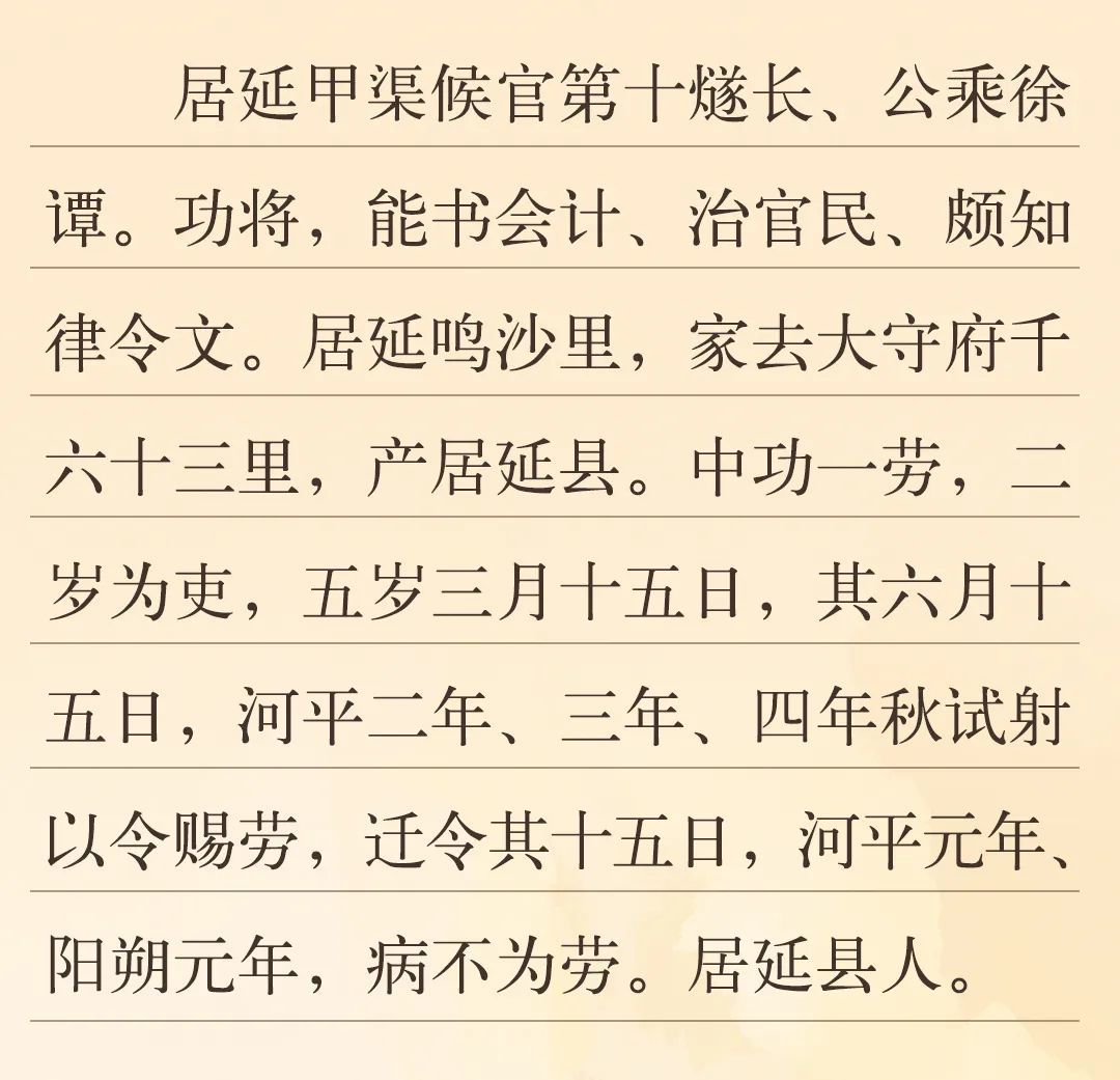 “中功一勞”中的“中功”指得到的功。功、勞、功勞、功績,是漢代計算政績的名稱與單位,戍卒與官員每日巡視、抵御外敵、參與秋射等,都能積攢“功”、“勞”。簡文中提到了“河平二年、三年、四年秋試射以令賜勞”,“秋試射”即漢代秋季比武活動之一的秋射。秋射成績優(yōu)秀可以賞賜勞績,漢代邊塞地區(qū)出土的簡牘中有大量以秋射獲勞的記錄,“功”與“勞”積攢到一定程度,便可升遷。當(dāng)這位官員所屬的候官發(fā)現(xiàn)空缺,便以功勞案為依據(jù),給出官員任免方案,呈報都尉府,以進行官員的升遷調(diào)動。