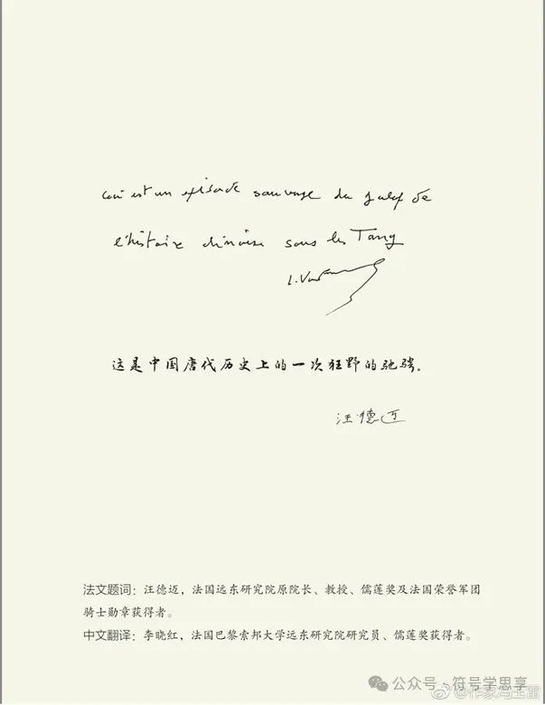 汪德邁先生對(duì)于馮玉雷這部作品給予高度評(píng)價(jià),2018年專門題辭:“這是中國唐代歷史上的一次狂野的馳騁。”馮教授專門把汪德邁先生給他的法文與中文題辭作為題簽印在書封面上,他多次跟我說:“幸遇汪德邁教授、李曉紅教授,受益良多,感激之情,難以言表。”