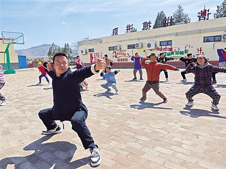 在晏家洼小學,記者看到,山頂?shù)年柟馀c風里,17個孩子整整齊齊地站在操場上,在陳偉禮的帶領下,有模有樣地練起來。弓步,出拳,眼神凌厲,撤腿,下蹲,身體下壓,此刻的孩子們像一只只努力展翅的雛鷹。