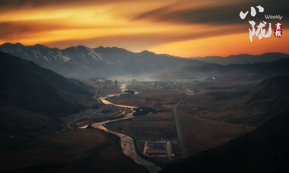 遠處連綿的群山白雪皚皚,山下青黃的草甸、安靜的藏式小村、飄蕩的經(jīng)幡、裊裊炊煙,勾勒出一幅美麗的畫。