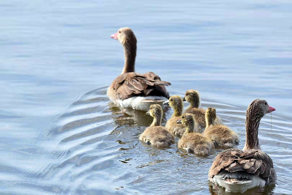 灰雁是鴨科雁屬鳥類,屬國家重點保護的“三有”鳥類,也是陽關(guān)濕地的夏候鳥。監(jiān)測顯示,在陽關(guān)濕地繁殖的灰雁家族有100多只。每年3月下旬遷飛至陽關(guān)濕地,4月中旬筑巢繁殖,5月上旬孵化出雛鳥4至5只?;已銥?ldquo;一夫一妻”制,孵化由雌鳥單獨承擔(dān),雄鳥在巢附近負責(zé)警戒。待雛鳥破殼出窩后,則由雌雄共同撫育。灰雁生性膽小、機警,小寶寶溜達時,雌鳥在前開道,雄鳥負責(zé)斷后,小寶寶上岸覓食嫩草芽時,雄鳥仍然負責(zé)警戒,若有危險立刻鳴叫警示。故而,近距離拍攝灰雁雛鳥是比較困難的。