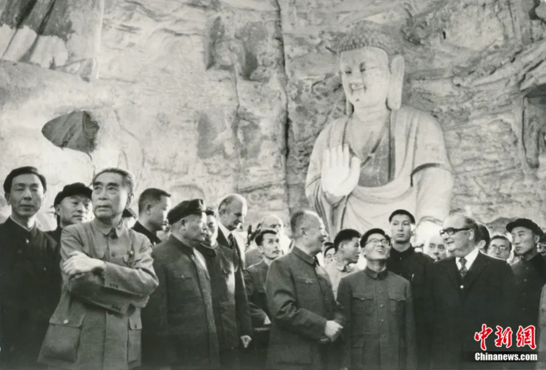 1973年9月15日,周恩來(lái)總理陪同時(shí)任法國(guó)總統(tǒng)喬治·蓬皮杜視察云岡石窟。云岡研究院 供圖