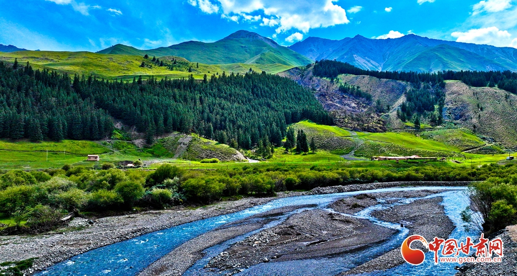 7月2日,祁連山國(guó)家公園甘肅省張掖市肅南裕固族自治縣大河鄉(xiāng)段,在高原藍(lán)天白云映襯下,群山環(huán)抱、 雪峰高聳,鳥鳴聲陣陣的濕地、奔騰不歇的黑河水、猶如“巨幅綠毯”的草原,勾勒出一幅風(fēng)光壯美的生態(tài)畫卷。